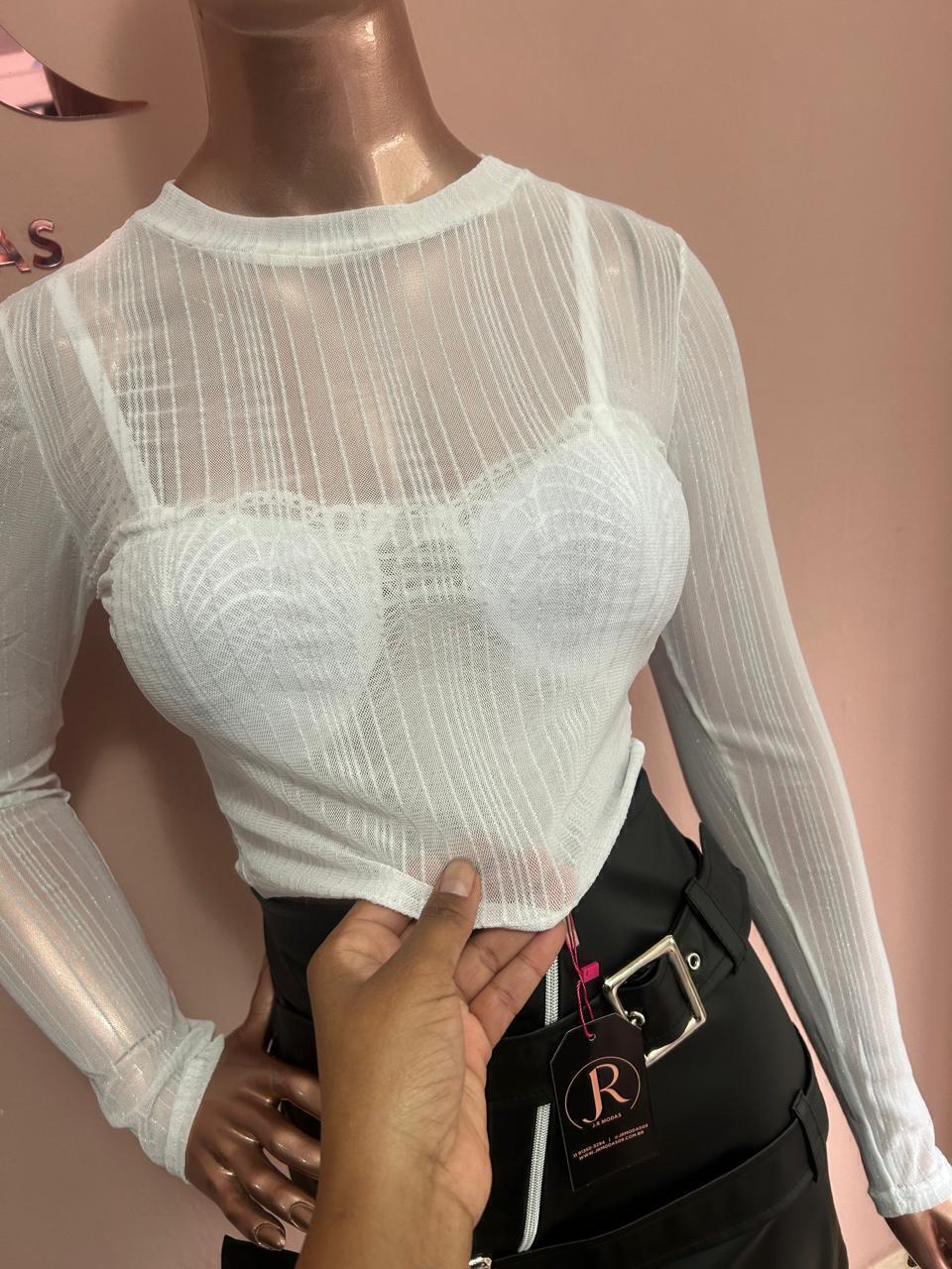 Cropped de tule com brilho manga longa Tecido: 91% poliamida 9% elastano Tamanho único serve TAM: 34/36/38/40/42 no máximo. Vou passar as medidas a baixo: altura:40 cm busto: 40 cm manga: 55 cm