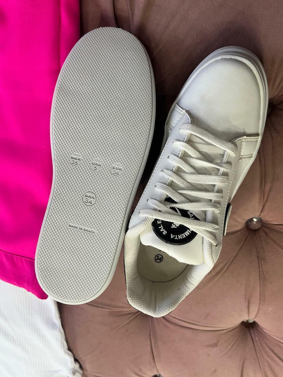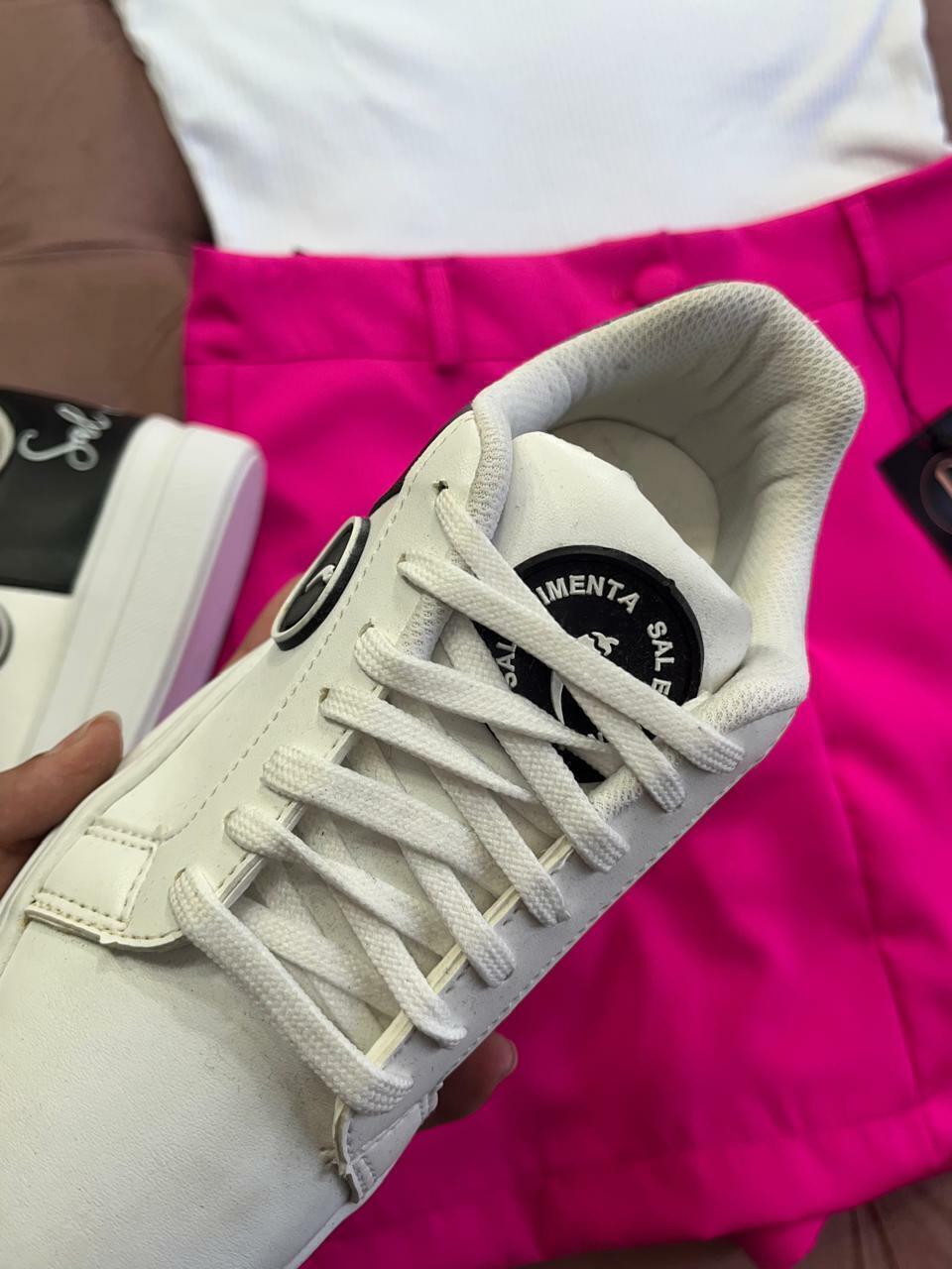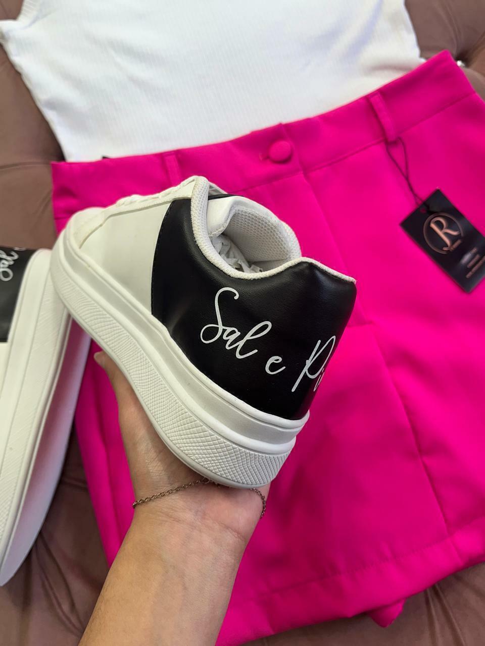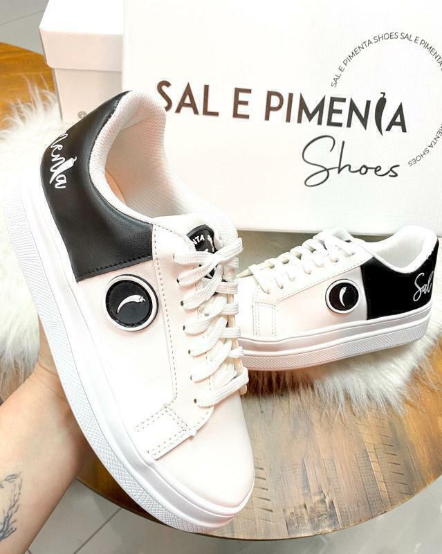 Tênis branco com detalhes em preto com escrita Sal e Pimenta e a pimenta do lado