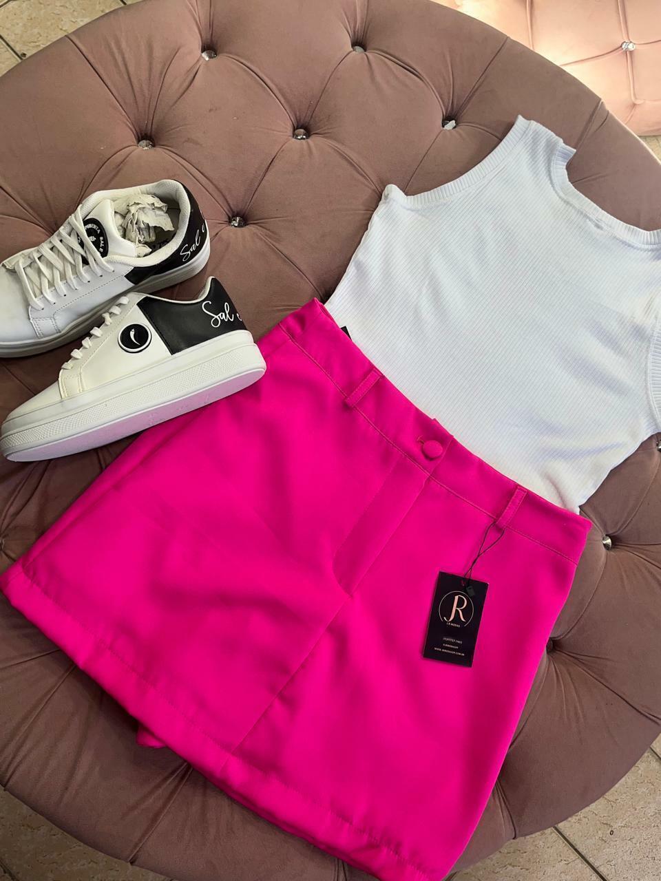 Short saia alfaiataria com botão encapado, short por baixo e saia por cima Short saia alfaiataria com botão encapado, short por baixo e saia por cima