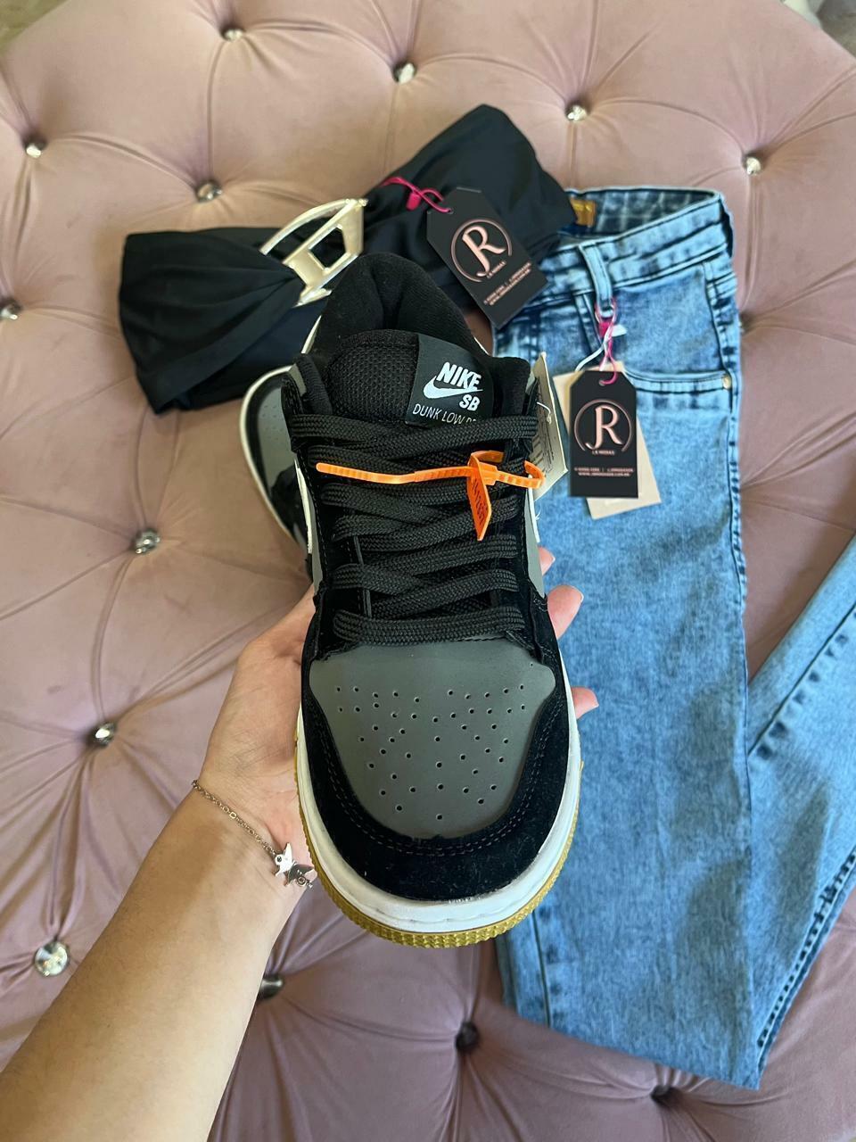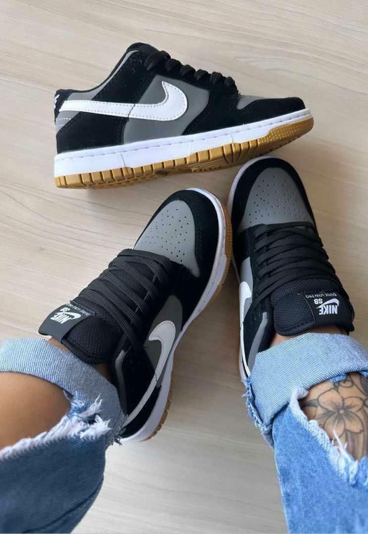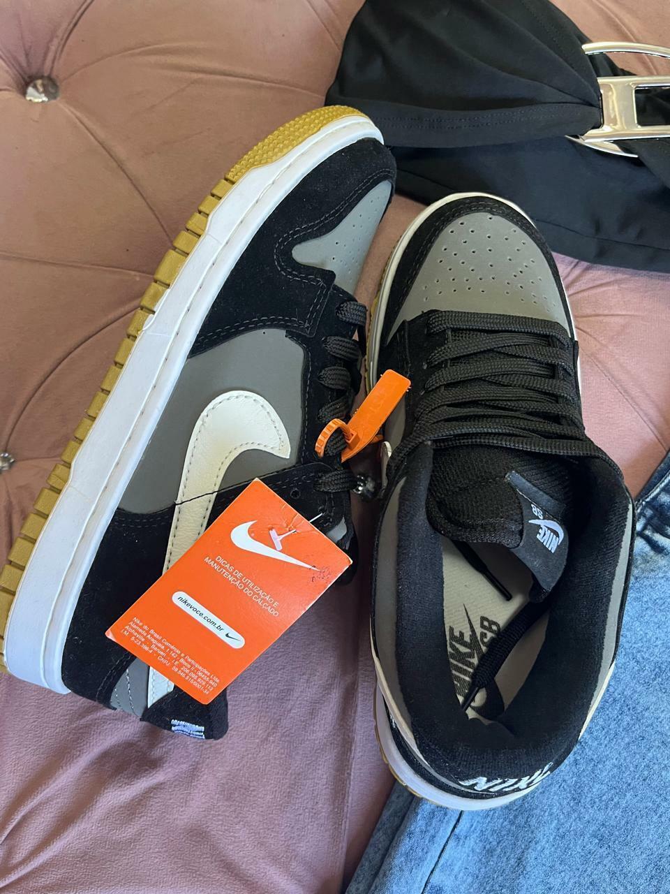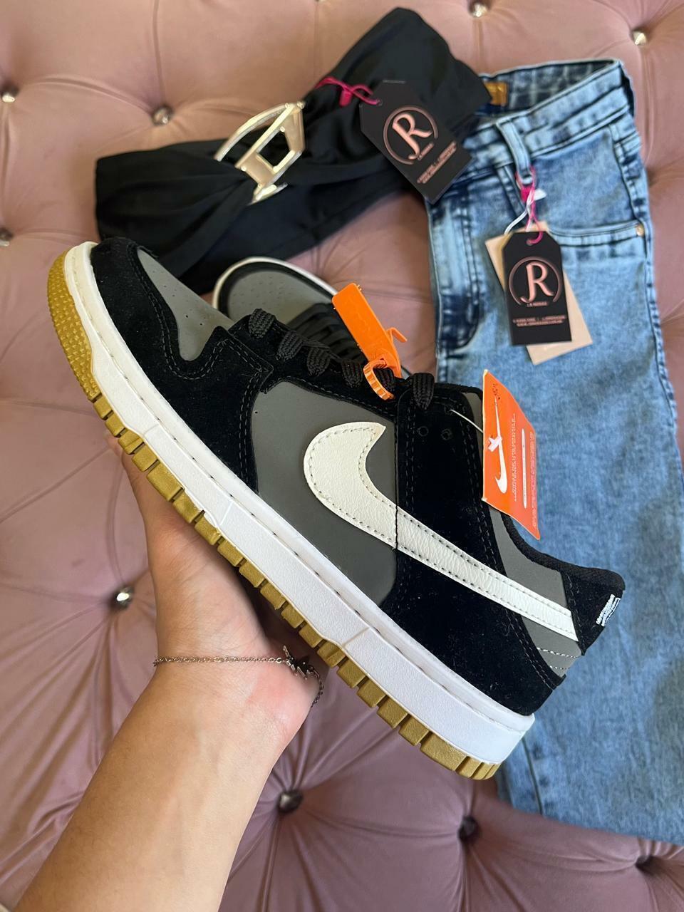 Tênis preto camurça com detalhes em branco e solado caramelo