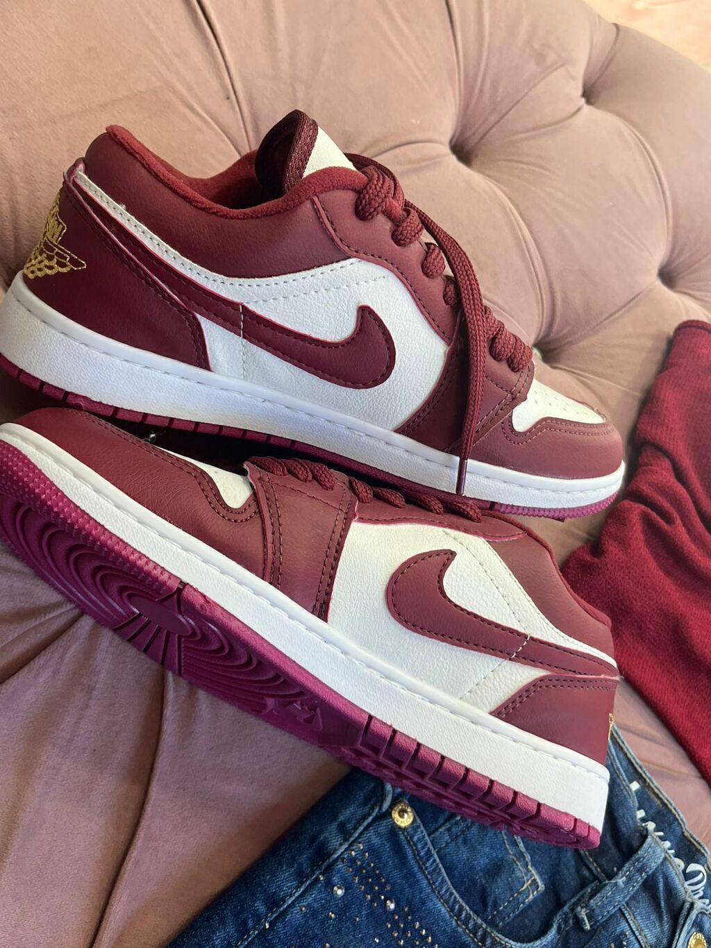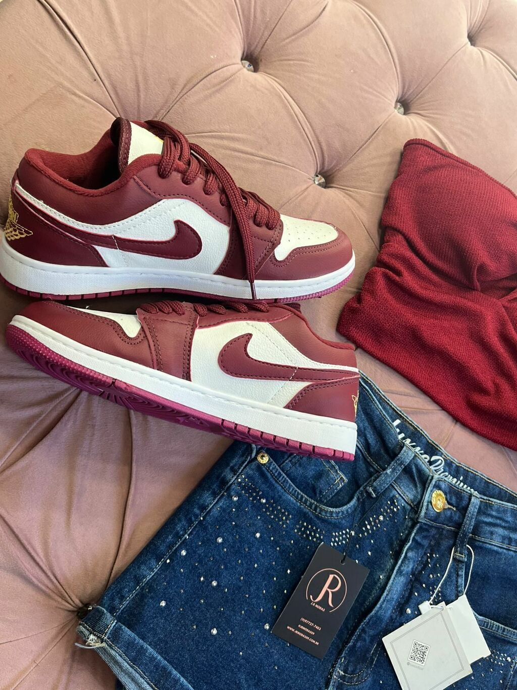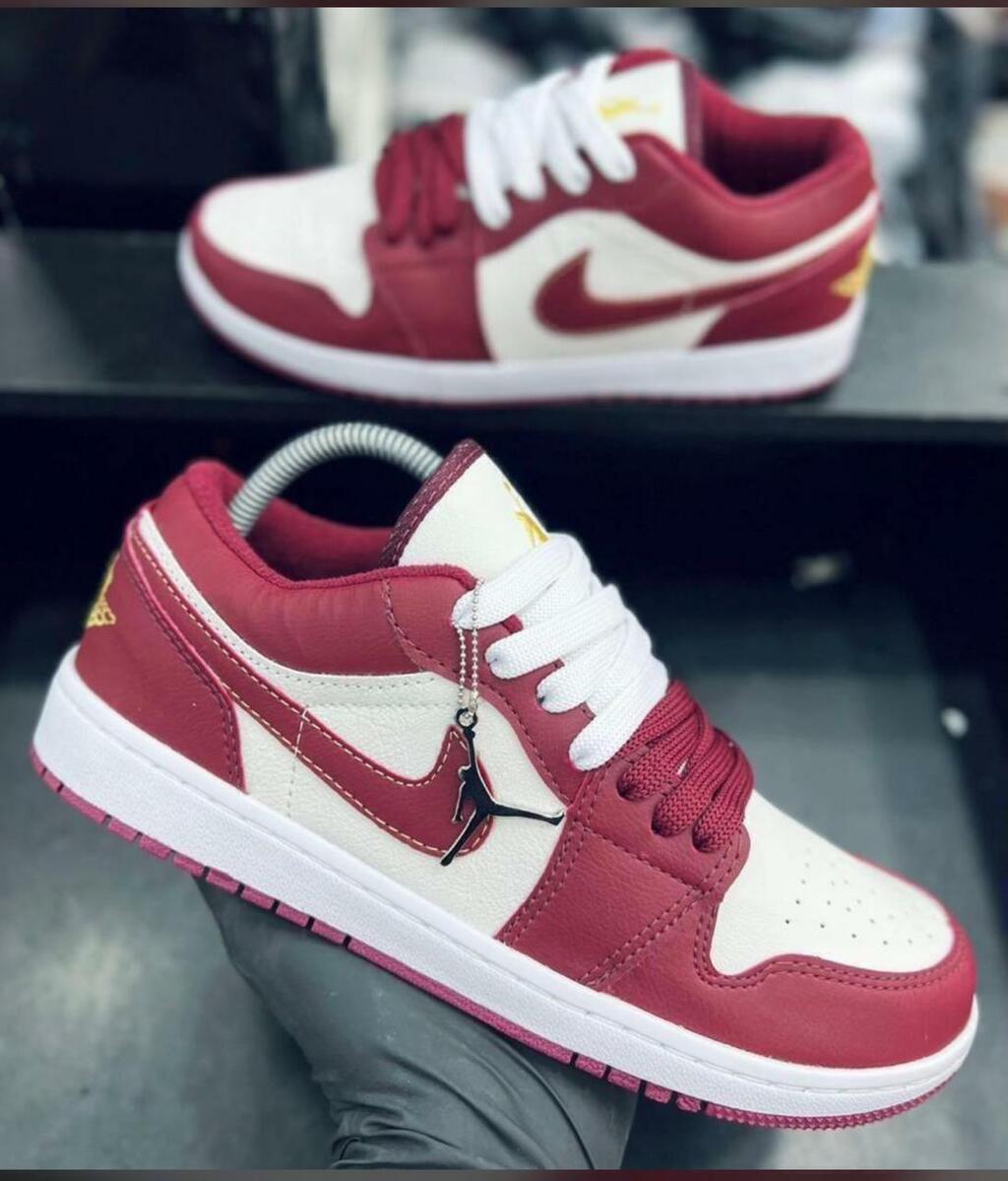 Tênis vinho com branco e detalhes em amarelo com dois cadarços